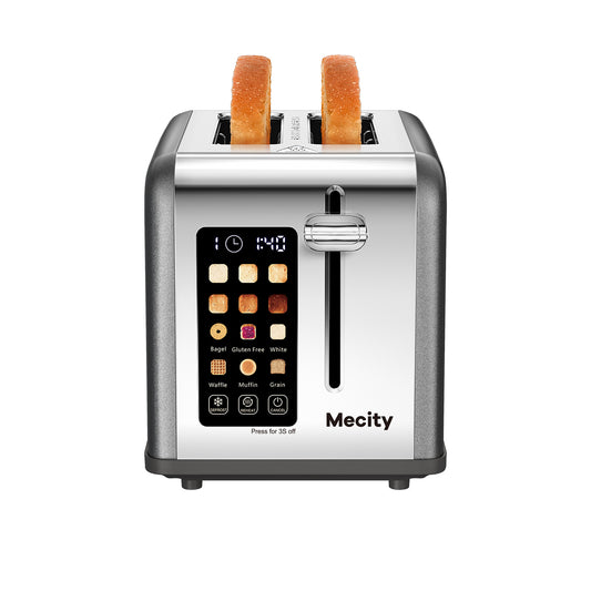 Mecity 2-Slice Touchscreen Toaster, Stainless Steel, Countdown Timer, 6 Shade Settings, Wide Slots, Reheat/Defrost/Cancel Functions, Removable Crumb Tray, Gray