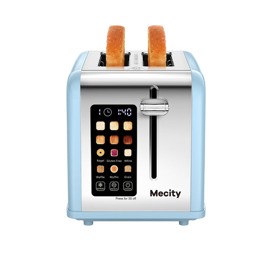 Mecity 2-Slice Touchscreen Toaster, Stainless Steel, Countdown Timer, 6 Shade Settings, Wide Slots, Reheat/Defrost/Cancel Functions, Removable Crumb Tray, Blue